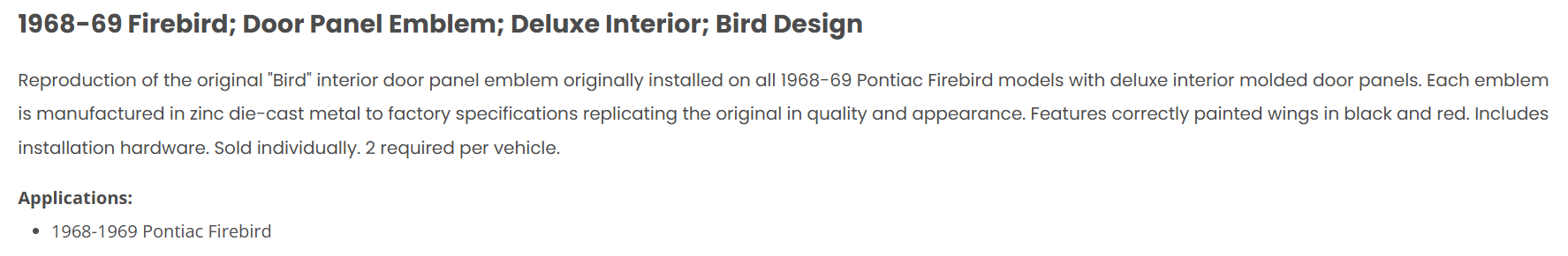 Image 1 of 1 1968-69 Firebird; Door Panel Emblem; Deluxe Interior; Bird Design $26.24 Quantity: Add To Cart Added! You Might Also Like 1970-81 Pontiac Trans Am Firebird Inner Glove Box Insert $45.00 1970-81 Pontiac Firebird Trans Am Formula Custom Horn Cap $39.95 New Custom Honeycomb Defrost Vents Inserts for 70-81 Pontiac Trans Am $69.95 1970-81 Pontiac Trans Am Firebird AC Duct Lower Left Under Dash $115.00 1970-1981 Pontiac Trans Am Firebird Hurst T-Top Bump Stop Bolts (2ct) $44.95